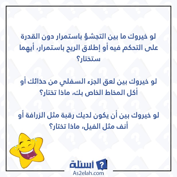 فيما يلي مجموعة أسئلة لو خيروك مضحكة جدًا: [1]